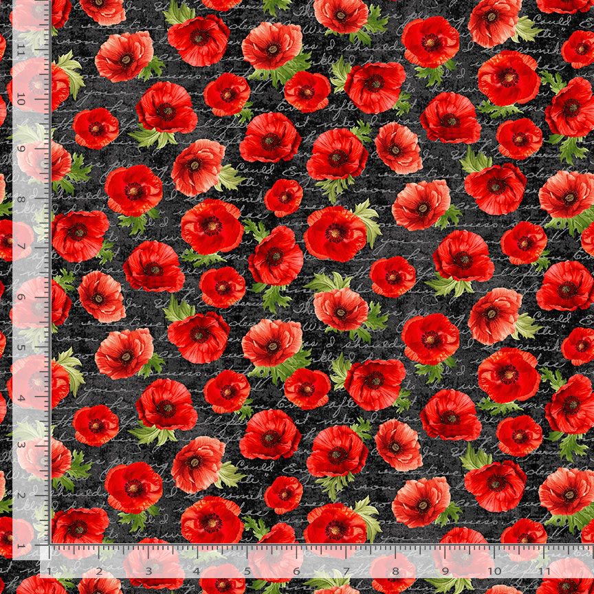 Poppy Passion Poppies on Script Fabric by Timeless Treasures, Red Flowers on Black